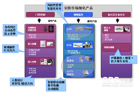 视频监控常规产品DVR、DVS和 IP摄像机都可以通过添加前端智能视频处理来增加风险性管理和智能化业务,在与摄像机相关的应用中,智能化可以满足移动侦测、集中检测和自动跟踪等需求。在传统的门禁系统中,生物特征识别不只是指纹,还可以是人脸监测和识别,这便能够自动判定身份而排除人为的弊端。对于侵入侦测和告警,采用智能视频手段将更加灵活和人性化,由此可视门铃类产品将有机会赋予更多的功能。在防火及生命安全的应用中,智能视频同传统的传感检测方式的结合将更加有效。