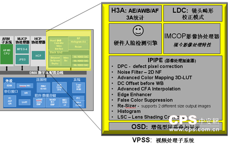 同样所谓光学元素的还有镜头畸形校正模式(LDC)处理。VPSS中还有硬件人脸检测引擎、影像协处理器(IMCOP)、影像处理加速器(IPIPE),以及增强型屏幕叠加显示(OSD)。VPSS还有预览和缩放功能,支持高清分量输出。TI在新型SOC中将采用新一代的ISP并增添更丰富的光学元素。