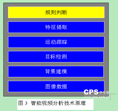 智能分析技术是图像处理、人工智能、机器视觉等多学科、多领域的交叉应用,基本算法包括背景建模、目标检测、运动跟踪、特征提取、规则判断等步骤,如图三所示。如何有效准确检测出前景目标是智能视频分析算法的关键,目前主流的方法包括差分法、背景模型法、光流法等。差分法的优点是实时性好,对场景的变化适应快,缺点是目标检测不完整,中间有空洞,抗干扰性差,树叶摇动、水波纹等都可能会被误认为是前景目标。光流法的优点是目标检测准确,而且可用于动态背景下的目标检测,缺点是运算量巨大,不适合于嵌入式设备的实时实现。