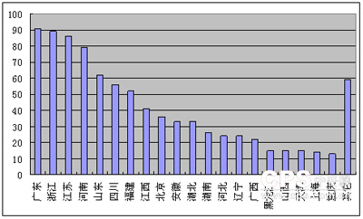 我们把新建项目按照省份进行统计得到图10,从中可见新建安防项目的地区分布状况。广东、浙江、江苏三省的安防项目数均在80个以上,项目数在60-70个之间的省是海南和山东,四川、福建、江西三省的新建项目数在40-60个之间。半数以上省市的新建安防项目数不到40个。