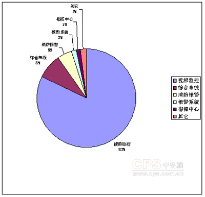 我们把调查数据按照视频监控、综合布线、消防报警、报警系统、指挥中心和其它进行了分类,从中可见8成以上的安防项目属于视频监控类项目。