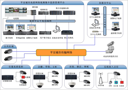 4. 根据项目建设的实际需求,在各个片区分别建设高清视频监控子系统,采用分布实施的步骤,覆盖城市的治安、交通、环保等领域,采用标准化结构,便于构建多级联网监控。