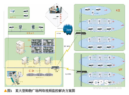 为了更好地为民众服务,近年来在一二线城市,建立了很多新型的购物广场。这类购物广场经营范围广、人员流量大,顾客的安全、商场店内物品的安全、停车场的安全等安防任务繁重,因此,利用现代的高科技手段,构建立体全方位防范系统是十分必要的。图1是某大型购物广场网络视频监控解决方案图。