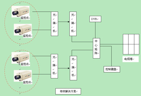 传输系统:主要是完成整个系统的数据传输,包括控制信号和视频、音频信号等,传输方式按照系统要求可以采用同轴电缆、双绞线、光纤以及无线传送方式,既可以采用专线传送,也可以租用电信通道传送,也可以采用模拟传送方式和数字传送方式。