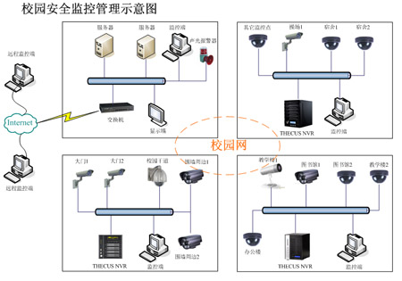 学校可以视实际需求布置监控点,如:学校的大门口、教学楼的出入口以及相关教室、办公楼的出入口和重要部位、图书馆的大门口、宿舍区及食堂的重要出入口、校区内的一些主干道及周边的一些重要位置。