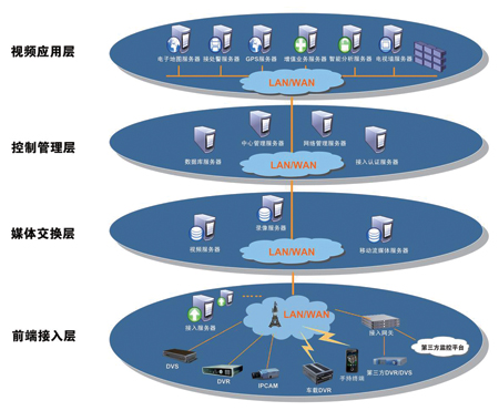 通过接入服务器连接多个厂家的车载前端设备,兼容了不同设备的差异性,为媒体交换层和控制管理层提供统一的接口。