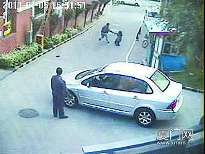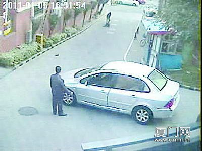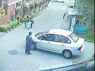 从监控中同样能够看到,就在张小姐开始遭劫的道闸口边上不到5米的地方,一名小区保安正站在那儿与一名坐在轿车里的司机交谈。抢劫刚开始,这名保安的注意力就被吸引过去了,然而他始终无动于衷,一直看着张小姐被拖倒在地,包被抢走。直到劫匪上了接应的白色轿车逃之夭夭后,这名保安才冲上前去。
