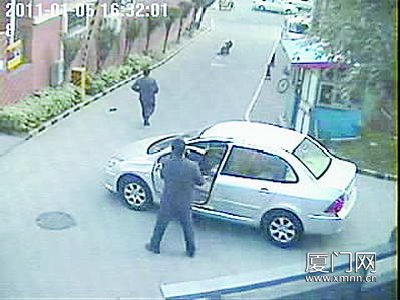 劫匪跳上前来接应的白色轿车走了,保安才冲上前。